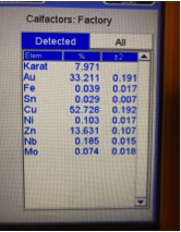 Illustrated below are XRF readings of some common materials that you frequently have coming into your stores. They are Gold Plated Brass/Copper, Gold Plated Sterling Silver (Vermeil) and 1/20 12 Kt. Gold-Filled. Before we start looking at these illustrations individually it’s important to understand that even though these readings are not true representations of the percentages of metal content by weight, these readings can be very helpful in actually identifying what the material is without the need for applying more destructive testing methods if you look for the proper clues. Now, looking at the XRF reading below for Gold Plated Brass we can see the Gold reading is below 10K but there is no Silver present and the Zinc content is 3X more than any jewelers alloy should have, so we can rule this material out as being any kind of typical karat gold. Actual Gold recovery on this type of material is in the range of 0.500% to 1.00%, but with the Gold-plated outer surface the XRF overstated the gold percentage by 30X, while the actual Copper percentage is most likely in excess of 90%. The picture showing the readings for Gold Plated Sterling Silver shows an overstatement of the Gold percentage which forces the Silver result to be understated. Actual Silver recovery for this material will be close to 92% with Gold running below 1%. The last picture below shows an XRF reading for a piece of stamped 1/20 12K Gold Filled, which should have a theoretical Gold Content of 2.50% but is reading 44% which could make an unsuspecting scrap buyer believe this could be 10K ; but with Nickel running in excess of 18% and it’s high attraction to a magnet are the indicators that help us avoid this mistake. The suggestion I hope you take away from this paragraph is to not just pay attention to what the readings are for the Precious Metals, when it’s often more important to pay attention to the other elements that are showing up or are present at abnormally elevated levels.